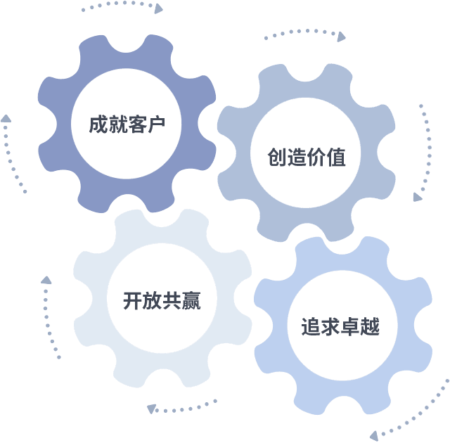 成就客户是一切决策的出发点,,创造价值是衡量所有工作的标准,,追求卓越是我们做事做人的态度,,,开放共赢是我们的格局也是最终的结果。。价值观的齿轮环环相扣,,,推动着组织里的每个人不断向前。。。